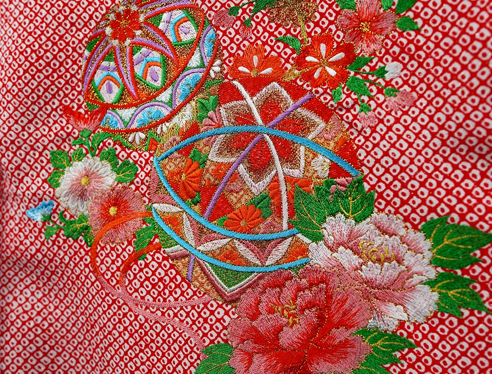 新品 お宮参り着物 女児祝着 初着 正絹 のしめ 商品説明 正絹の縮緬地に金糸が織り込まれた生地に 赤の疋田(絞り柄*伝統柄)に総刺繍になります。